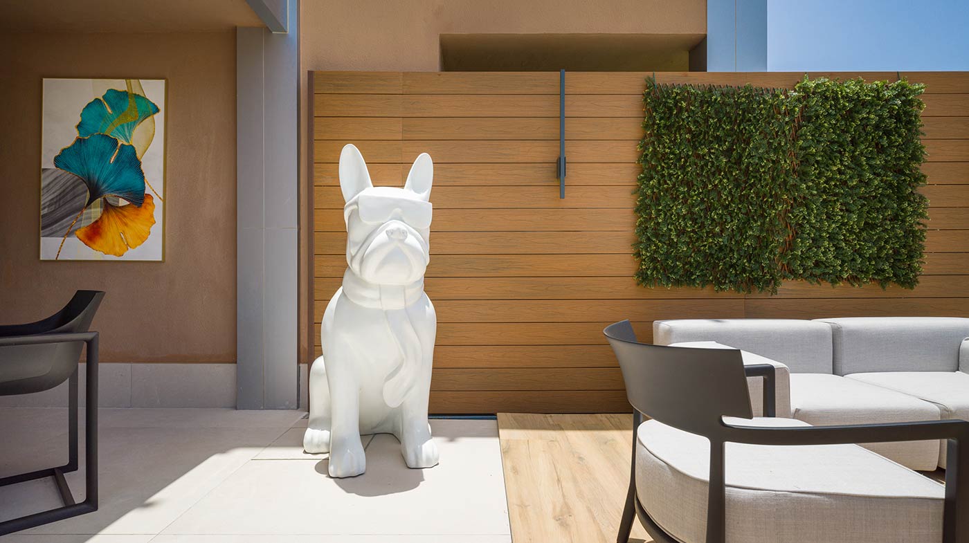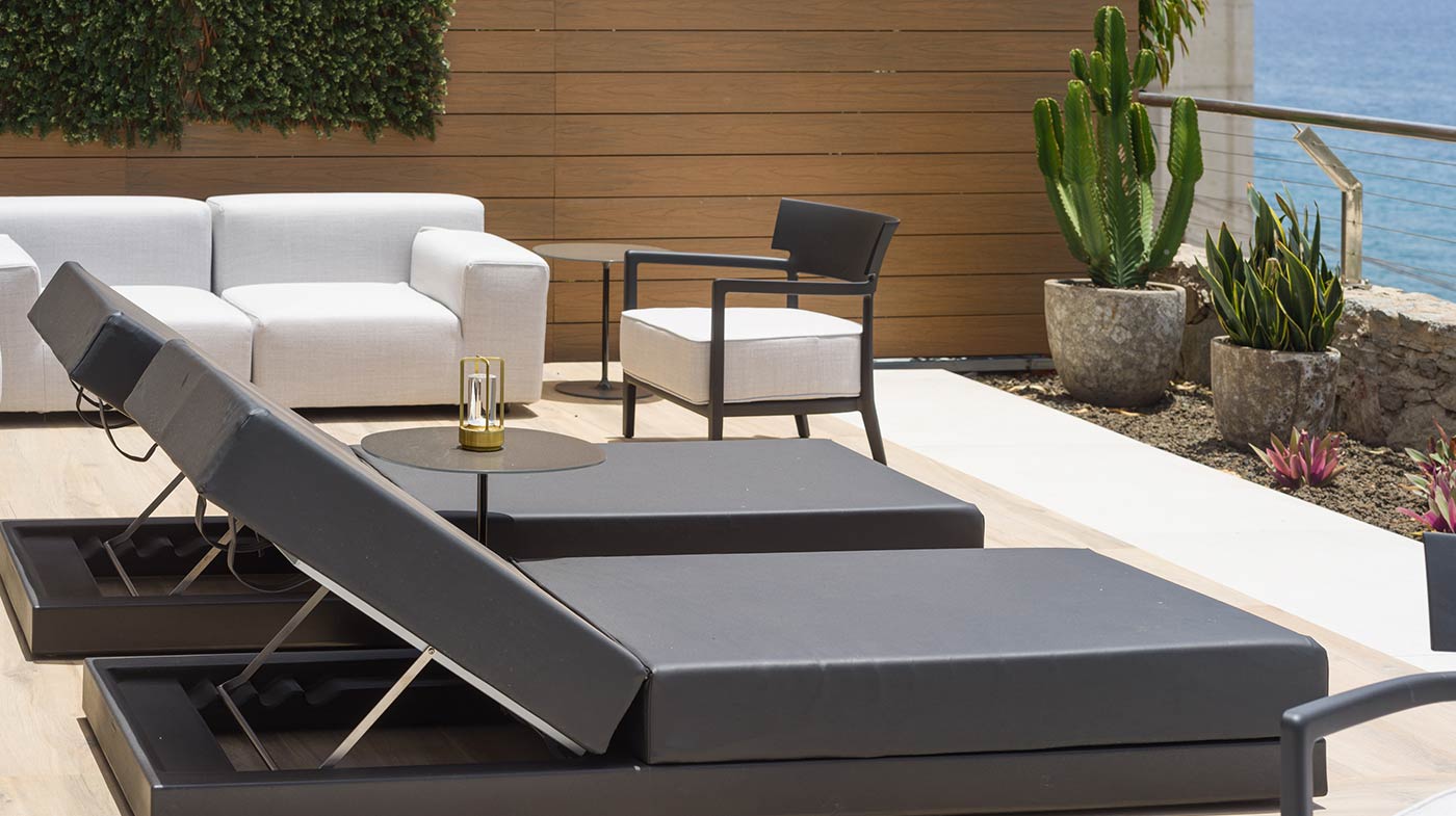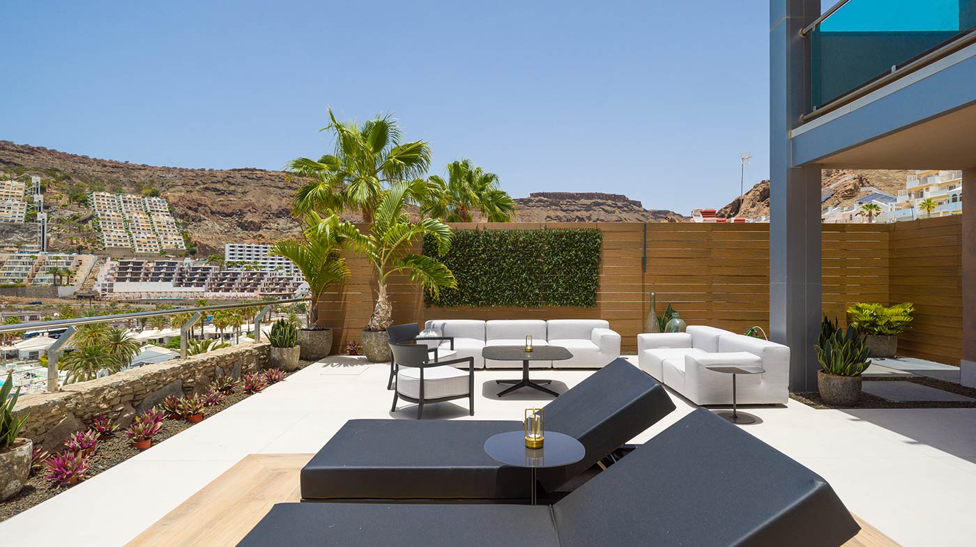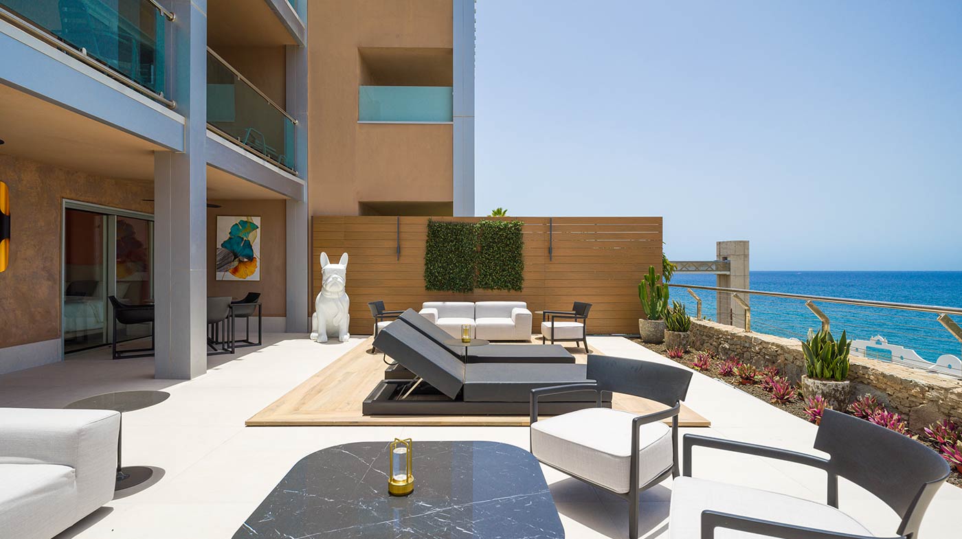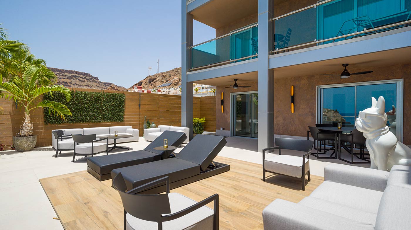 - Mobiliario Exterior: Hamacas y comedor Vondom, sofá de 3 plazas y 3 unidades de 2 plazas de Kartell, mesa de mármol y mesas auxiliares Kartell.