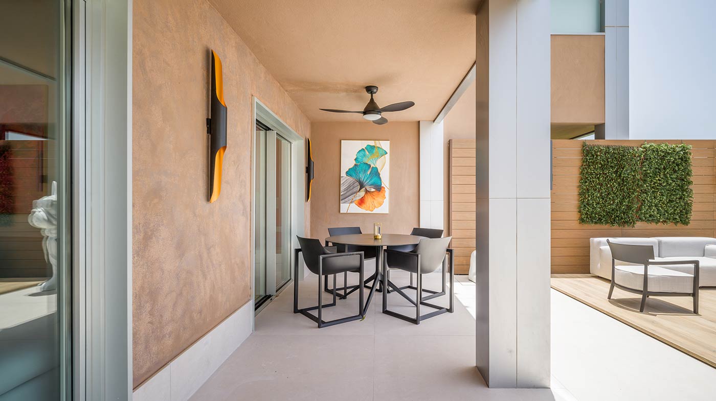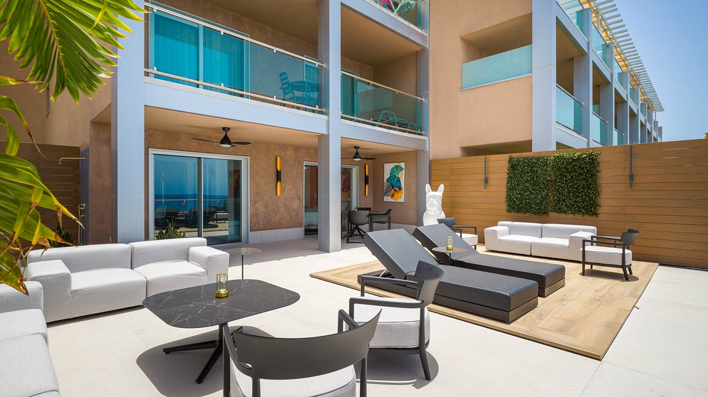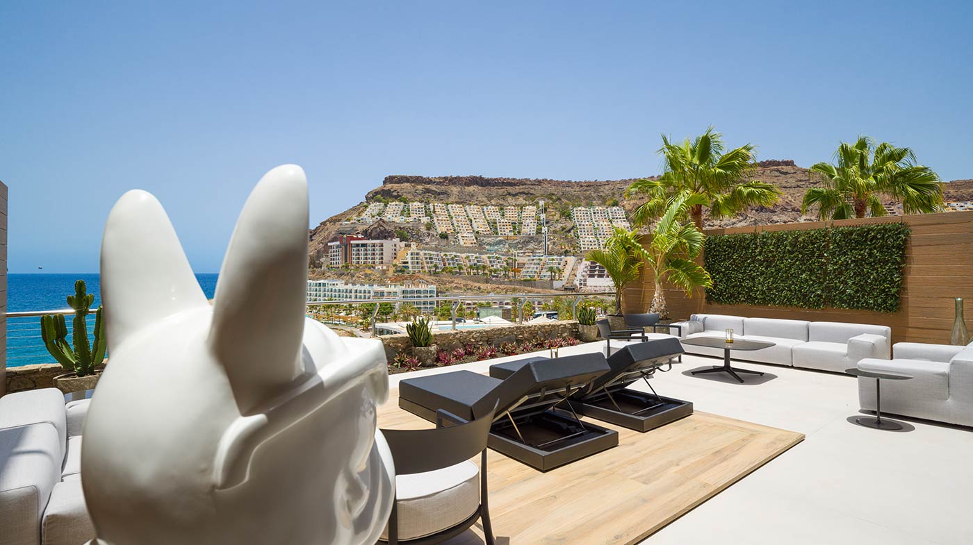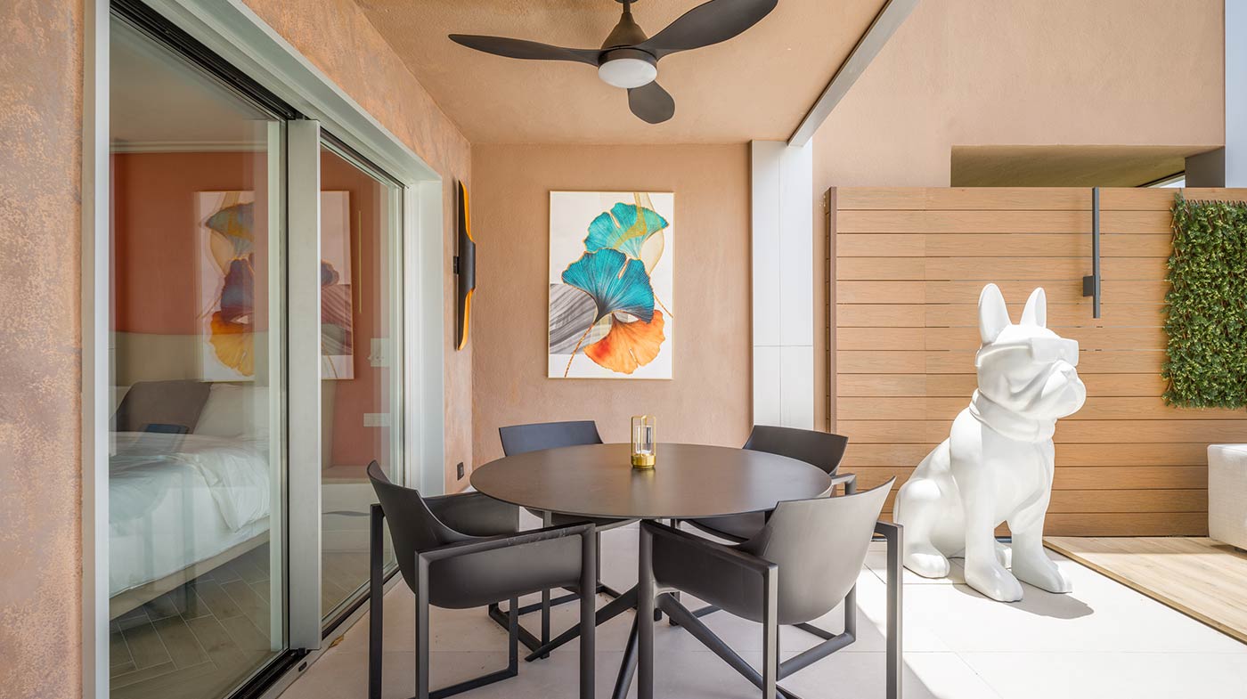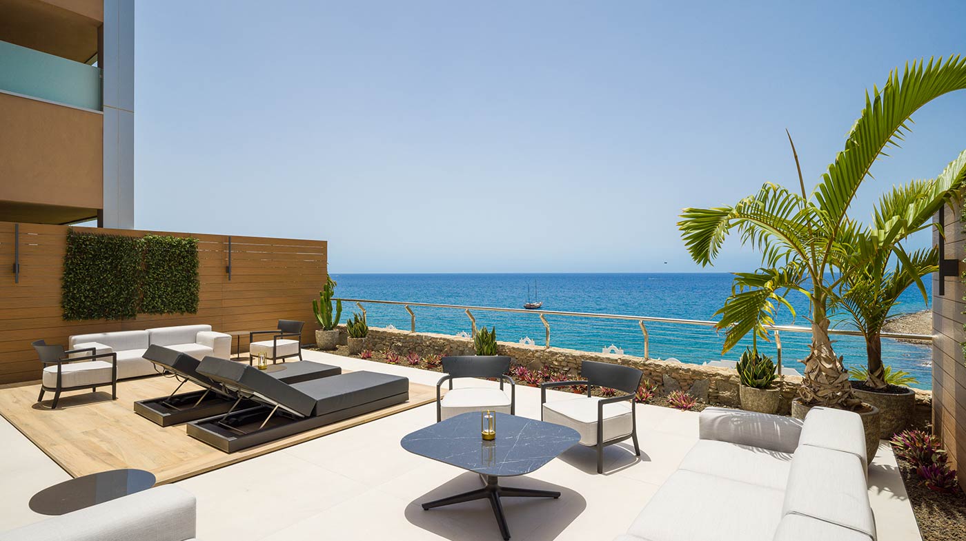 - Mobiliario Exterior: Hamacas y comedor Vondom, sofá de 3 plazas y 3 unidades de 2 plazas de Kartell, mesa de mármol y mesas auxiliares Kartell.
