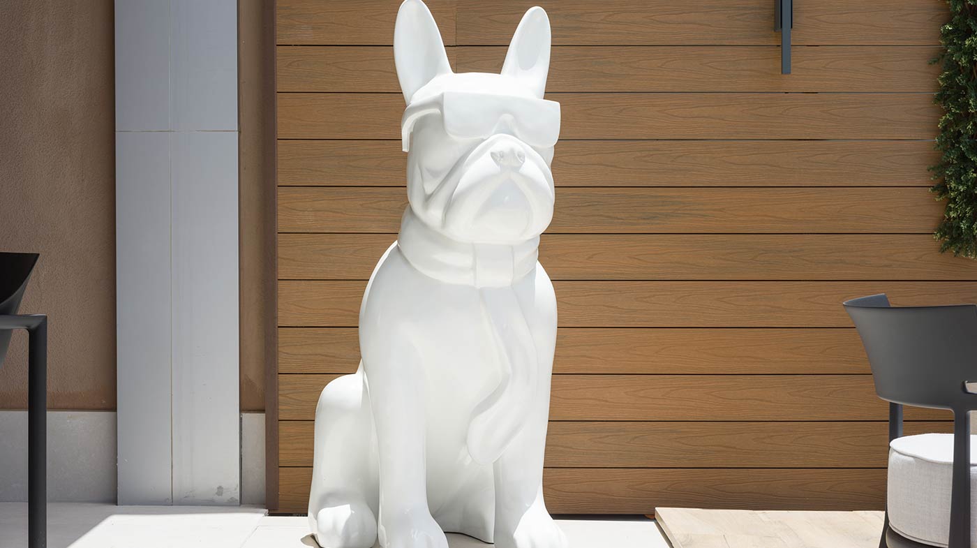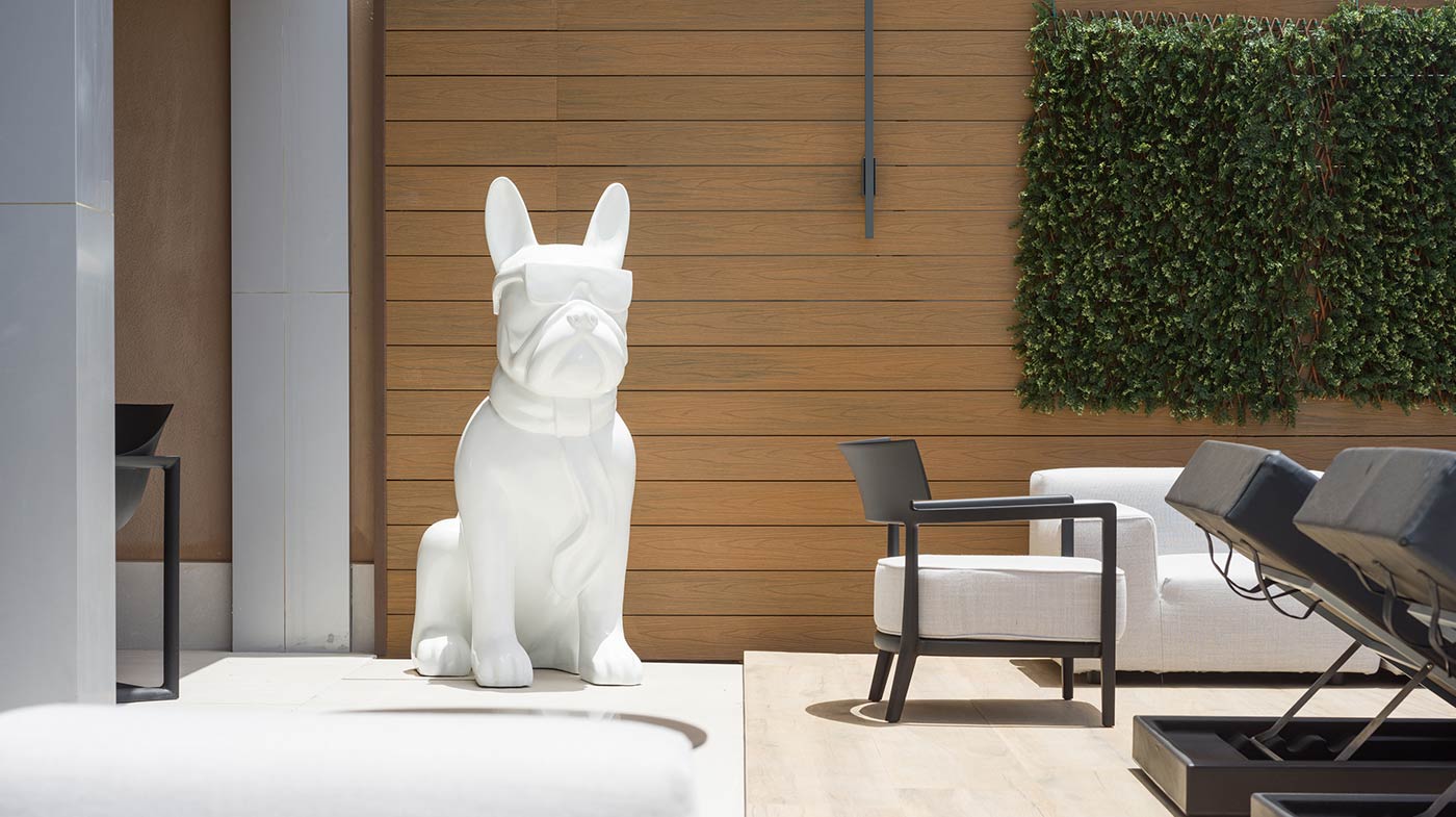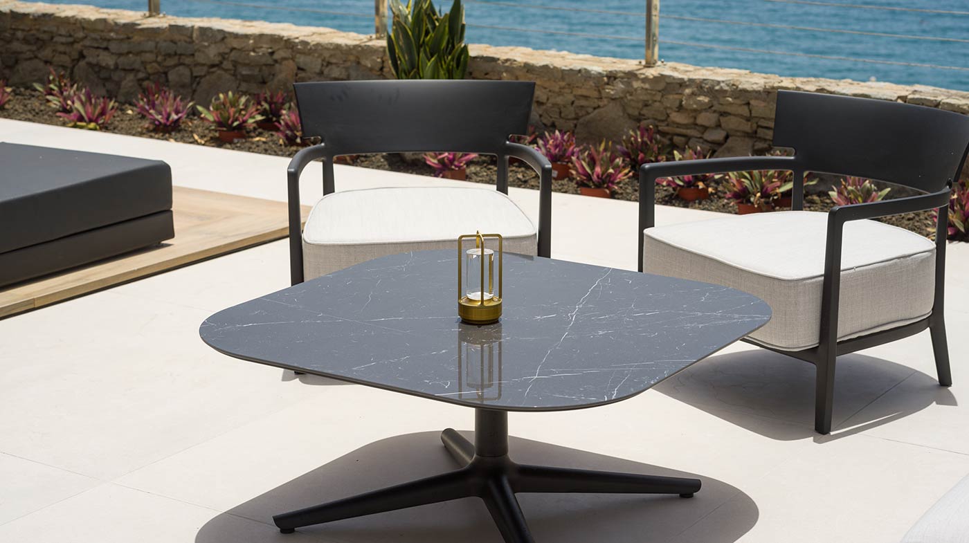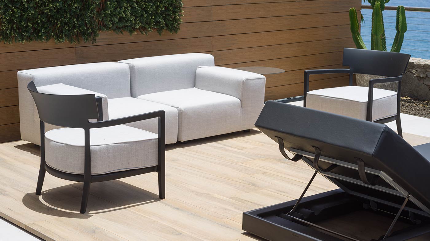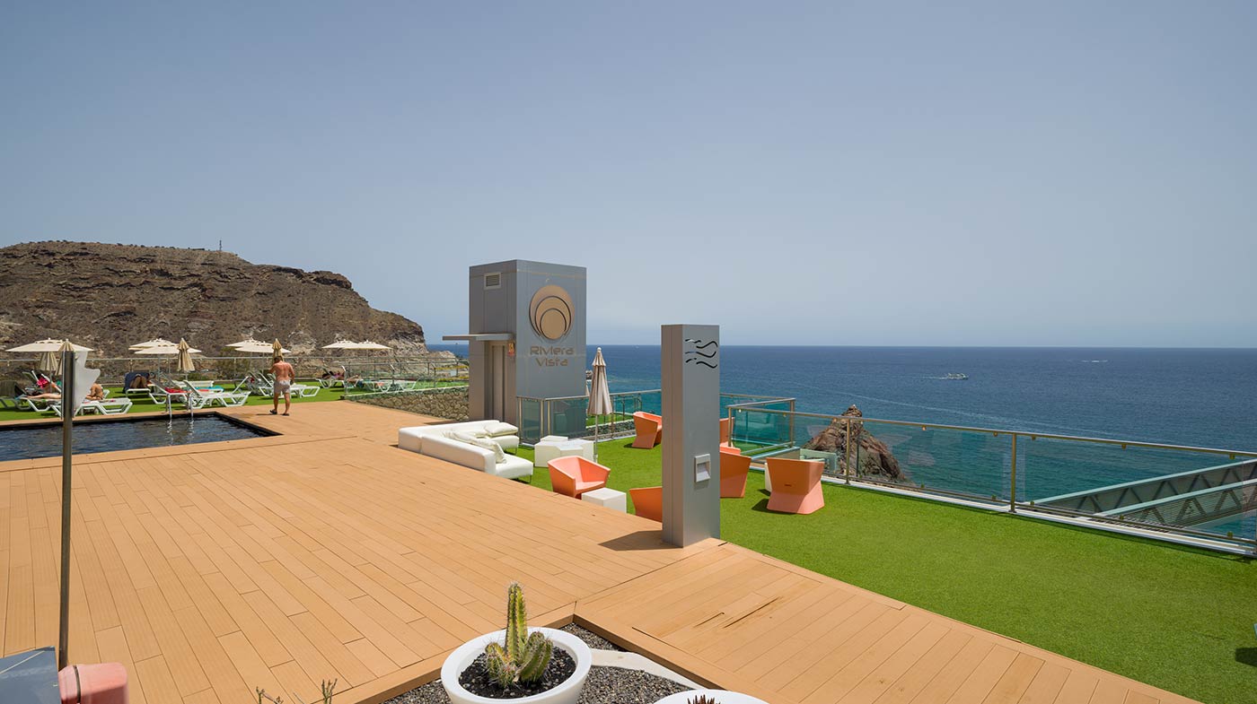 - Mobiliario Exterior: Hamacas y comedor Vondom, sofá de 3 plazas y 3 unidades de 2 plazas de Kartell, mesa de mármol y mesas auxiliares Kartell.