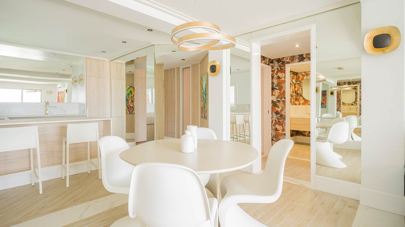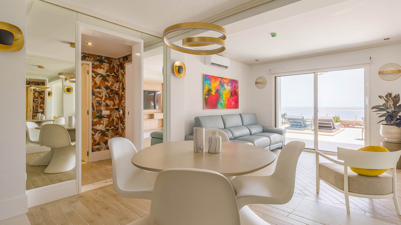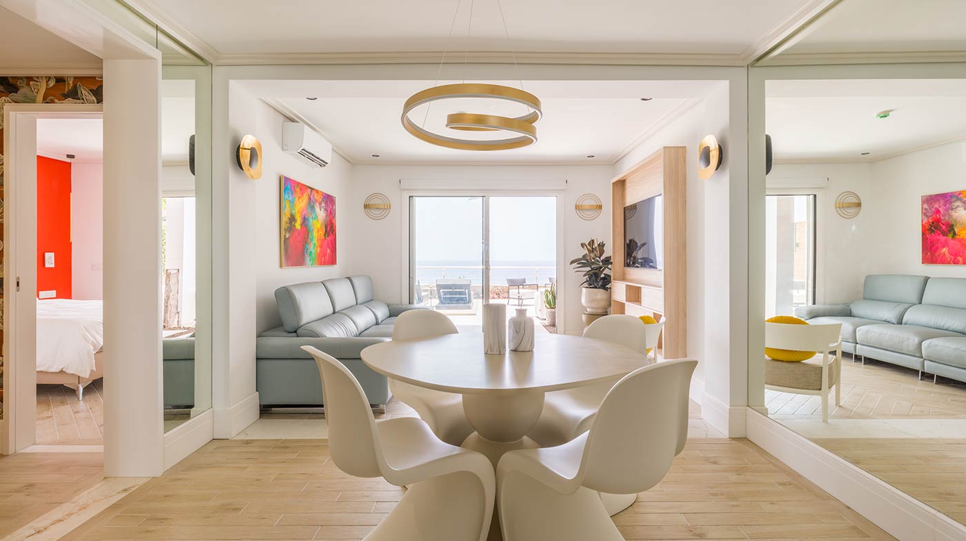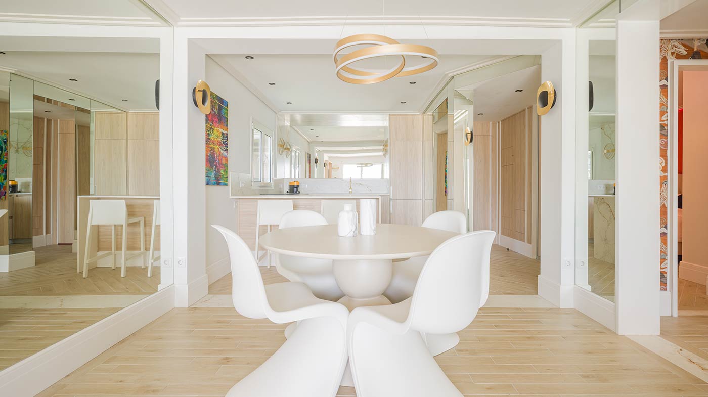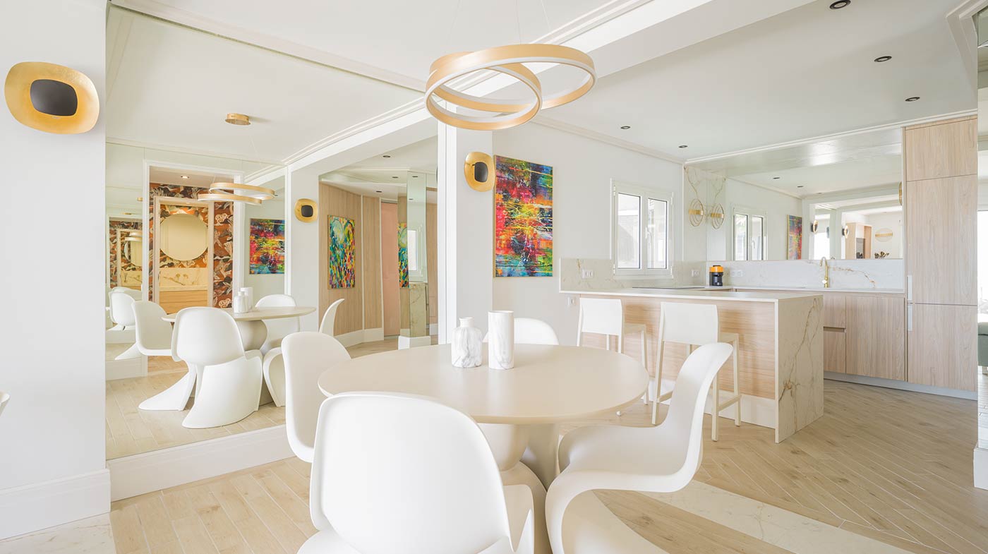 - Interior: Sillas de comedor Panton, butaca y sofá Kartell, grifería dorada Rovira, papel pintado Arte, Colección Le Corbusier, molduras Orac Decor, inodoro japonés automático, regulación de tiras LED, encimera y alicatados Neolith, ventanas correderas Cortizo con perfil slim, y aire acondicionado.