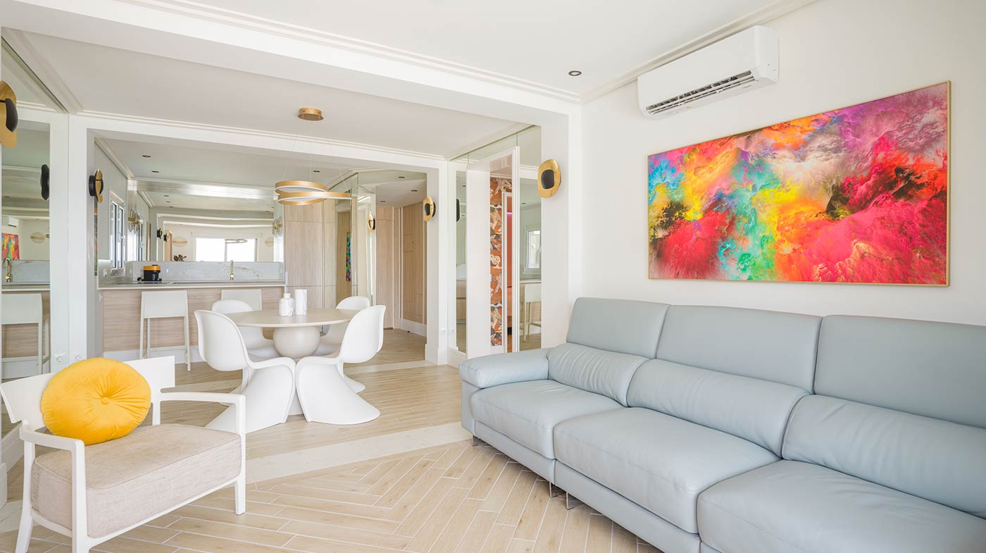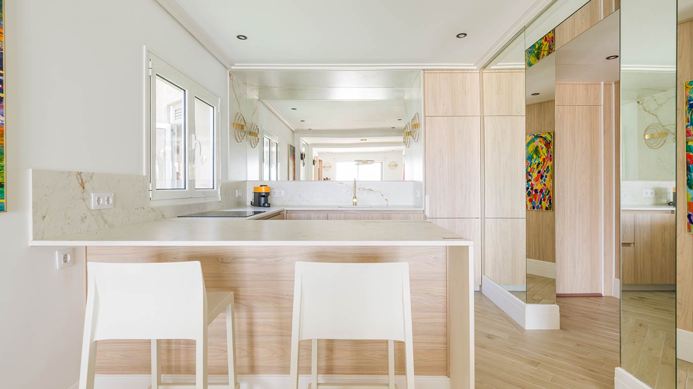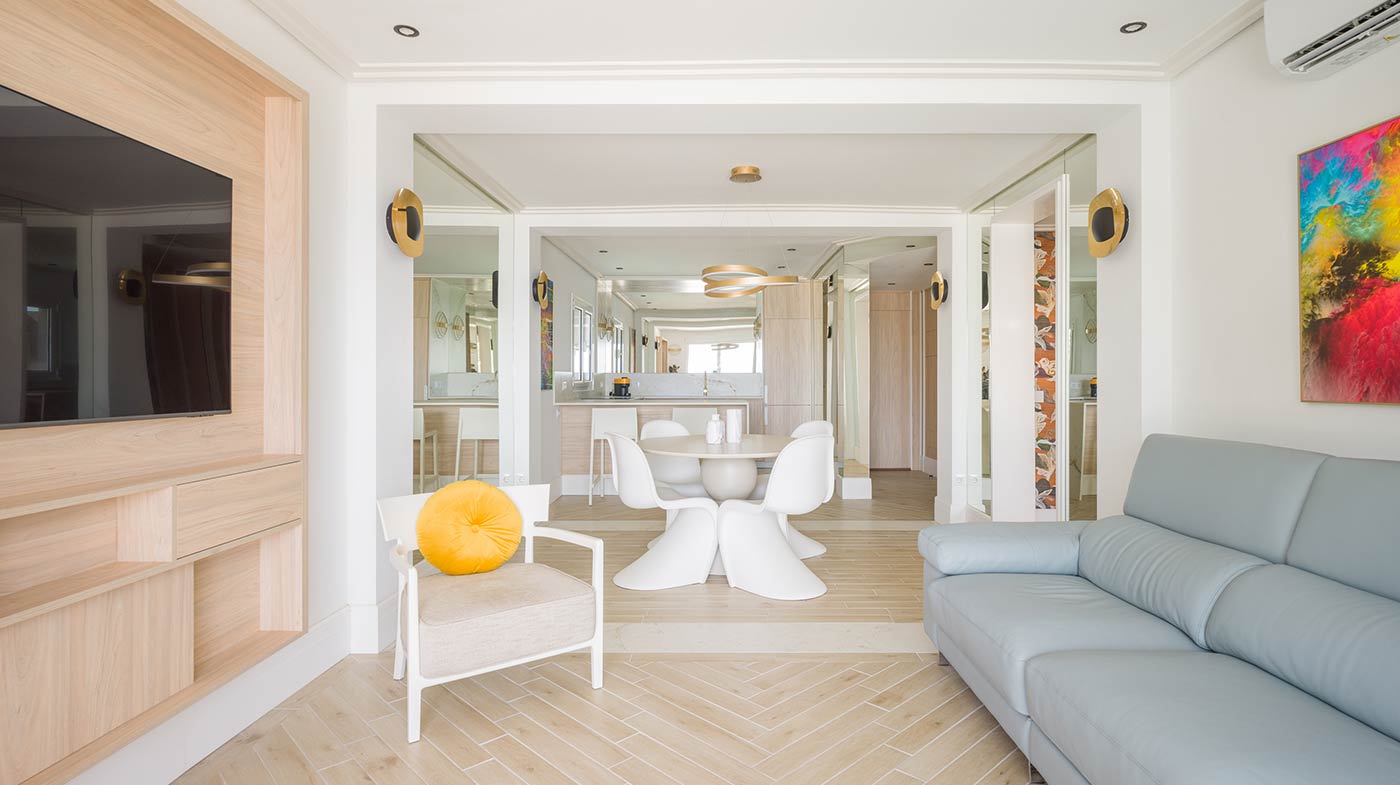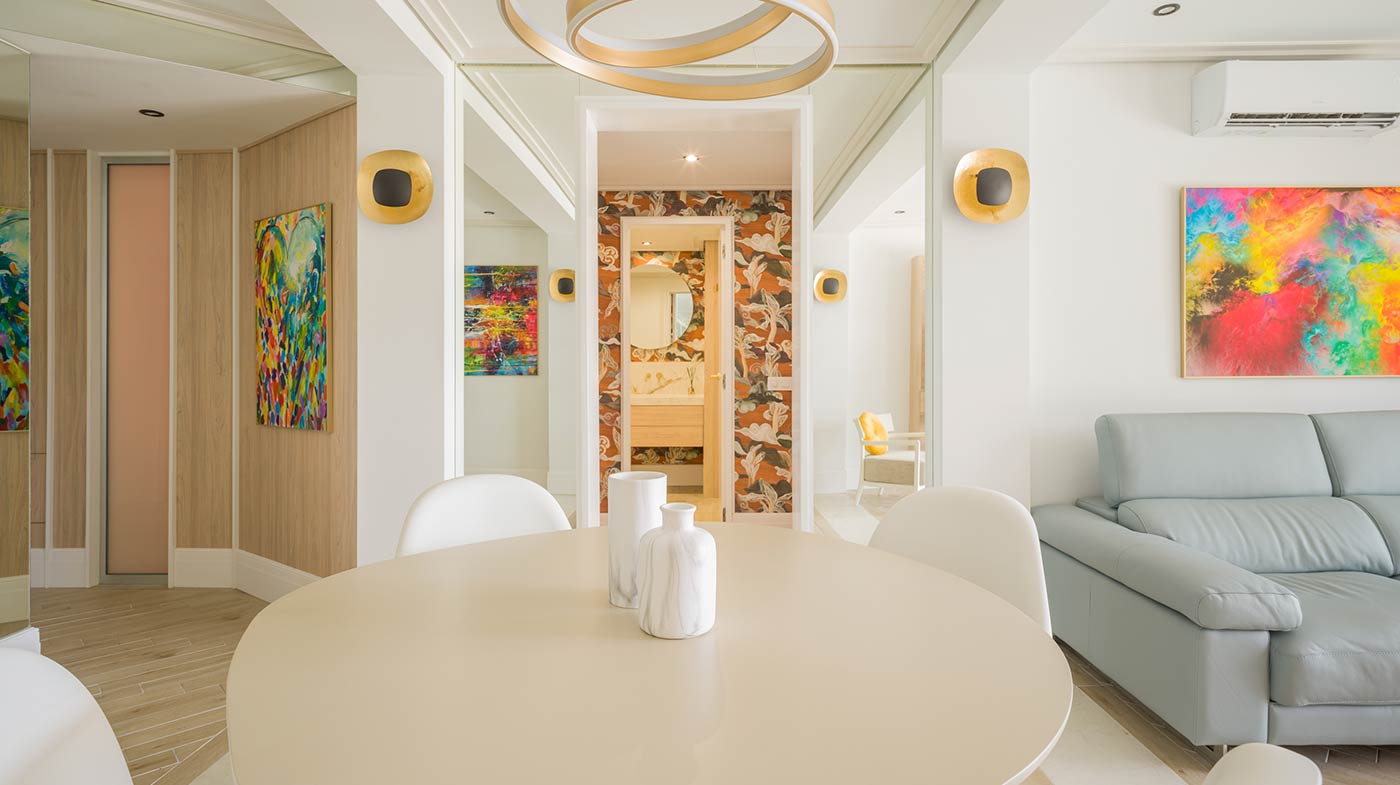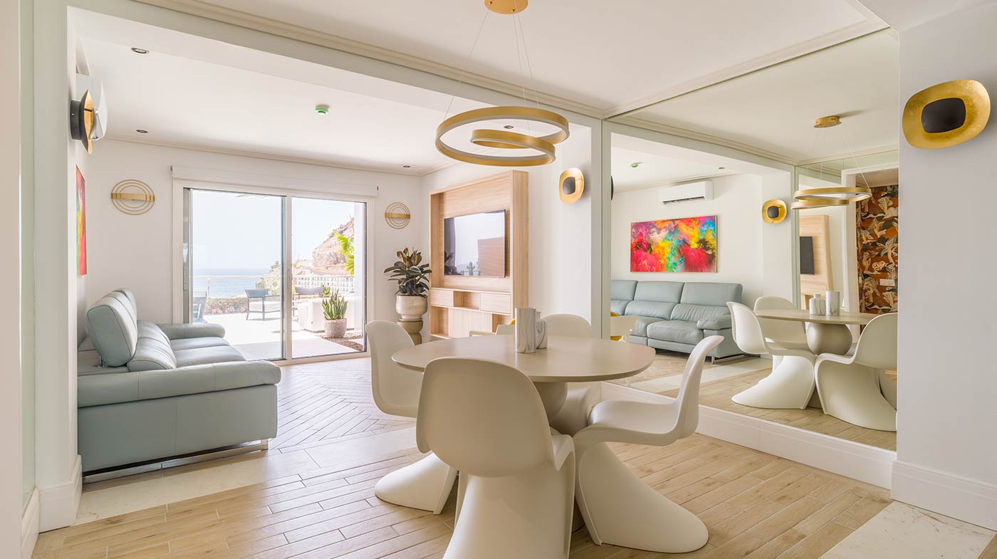 - Interior: Sillas de comedor Panton, butaca y sofá Kartell, grifería dorada Rovira, papel pintado Arte, Colección Le Corbusier, molduras Orac Decor, inodoro japonés automático, regulación de tiras LED, encimera y alicatados Neolith, ventanas correderas Cortizo con perfil slim, y aire acondicionado.