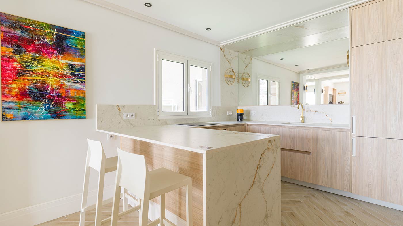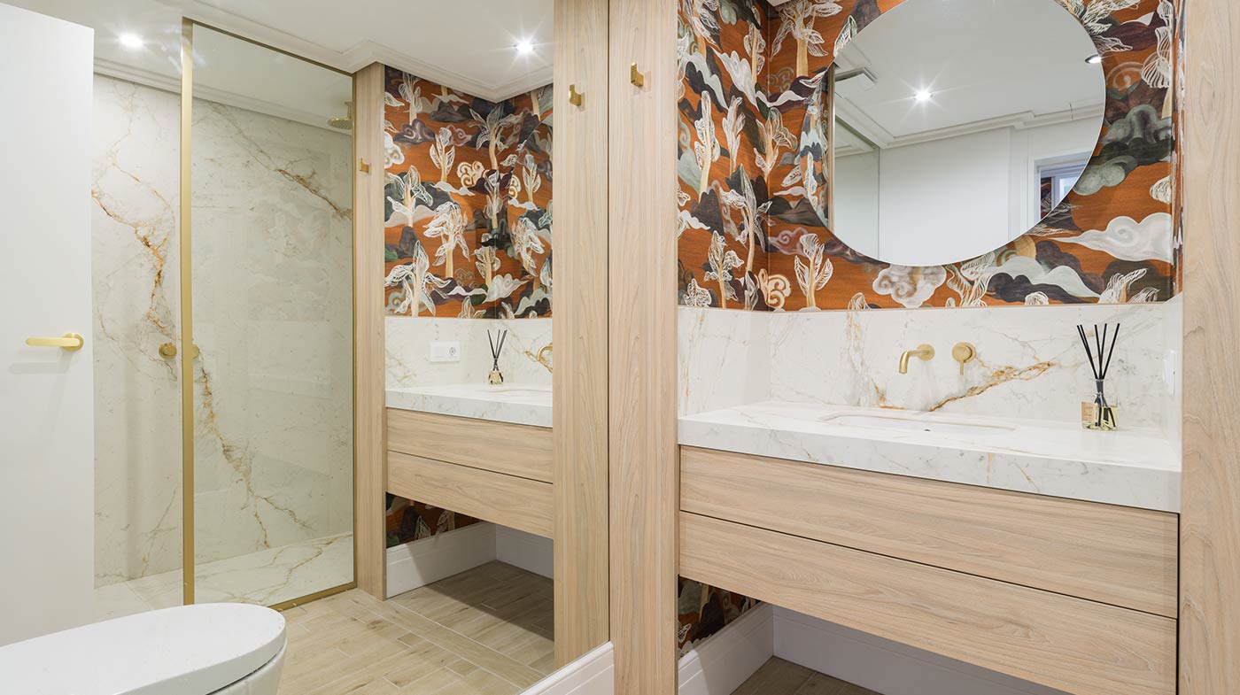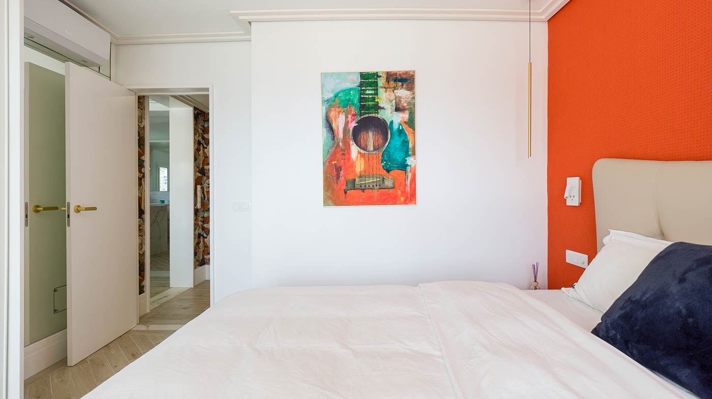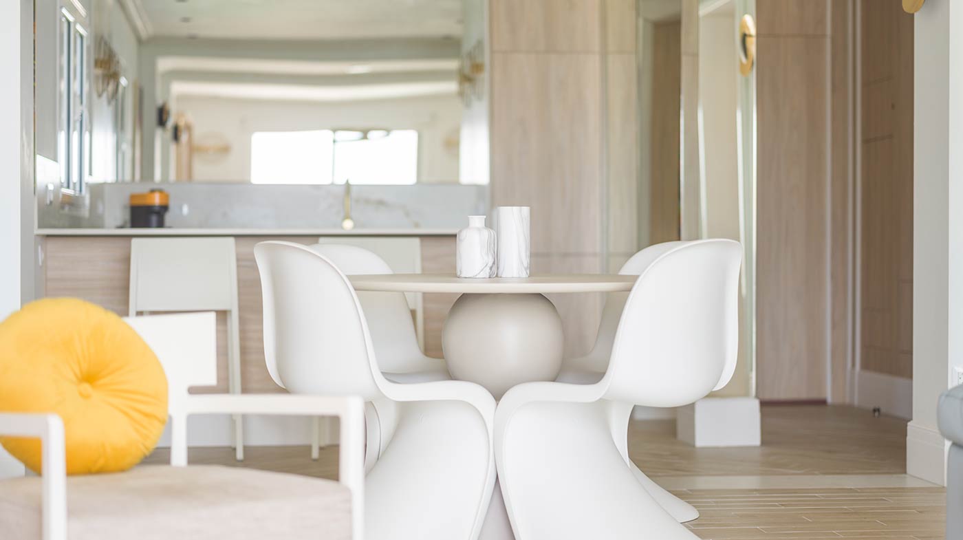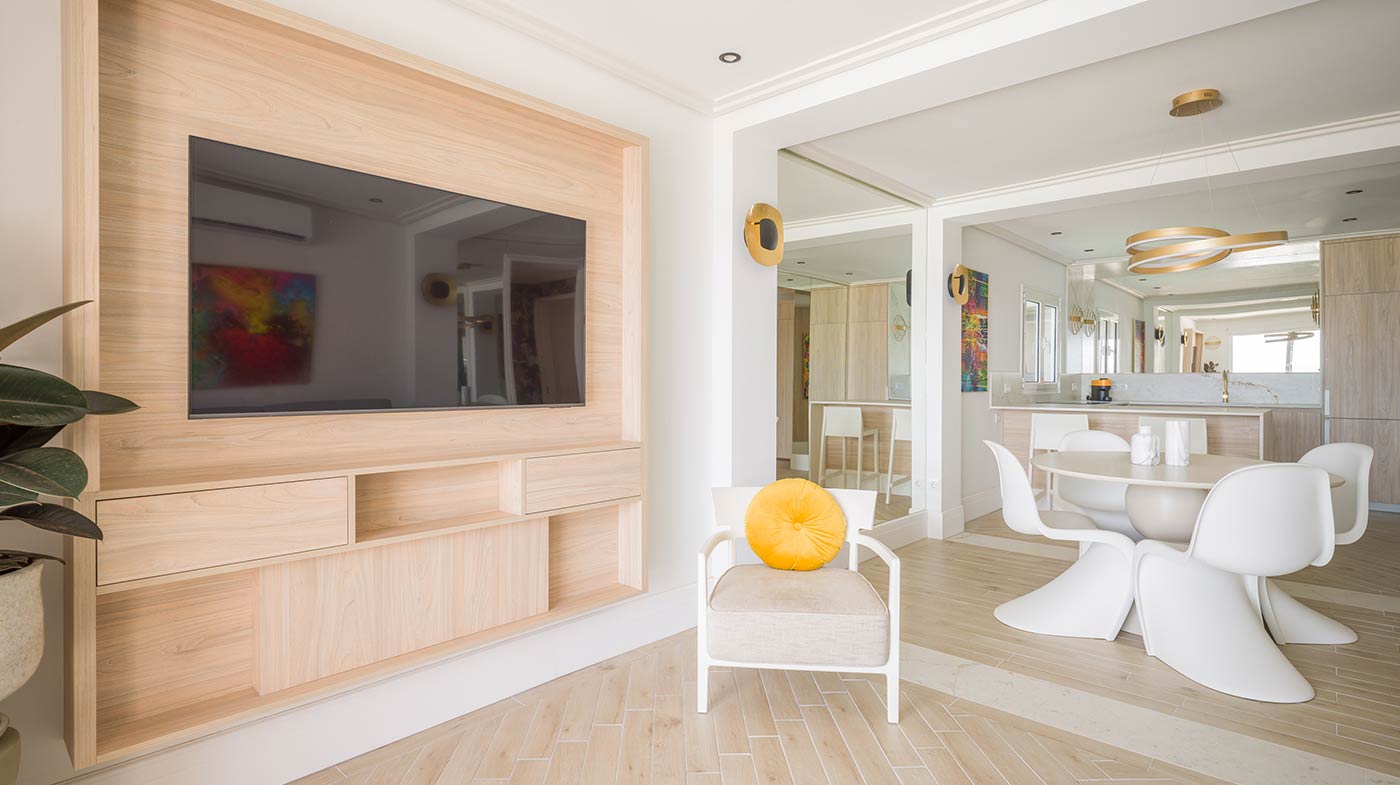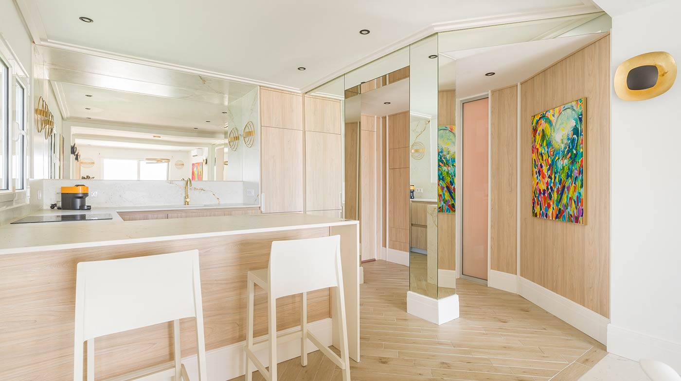 - Interior: Sillas de comedor Panton, butaca y sofá Kartell, grifería dorada Rovira, papel pintado Arte, Colección Le Corbusier, molduras Orac Decor, inodoro japonés automático, regulación de tiras LED, encimera y alicatados Neolith, ventanas correderas Cortizo con perfil slim, y aire acondicionado.